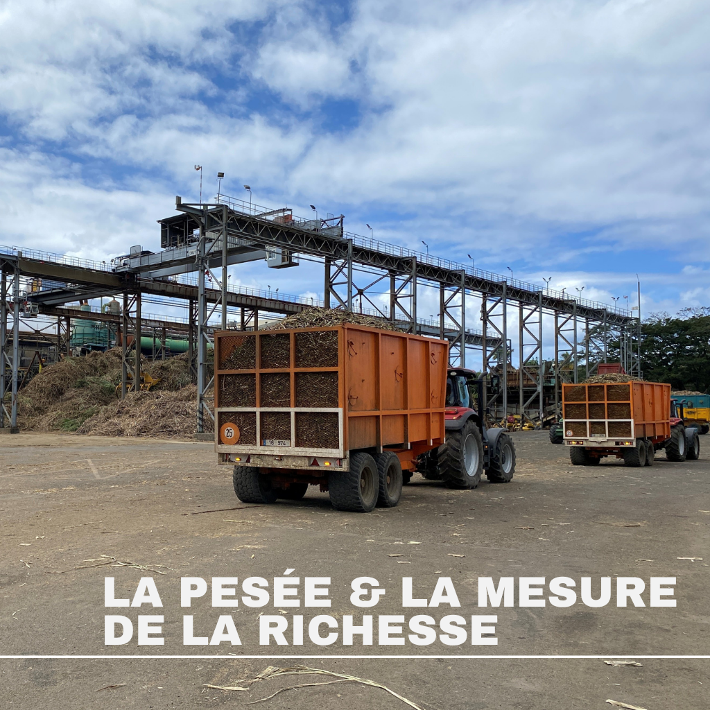 Rassemblées dans une remorque, les cannes partent ensuite au centre de réception où les chargements sont pesés : la richesse en sucre est alors évaluée. Ce n’est qu’après ces vérifications que les cannes sont livrées à l’usine sucrière où elles sont broyées pour obtenir le jus de cannes. C’est ce jus qui donnera le sucre après plusieurs opérations de cristallisation.