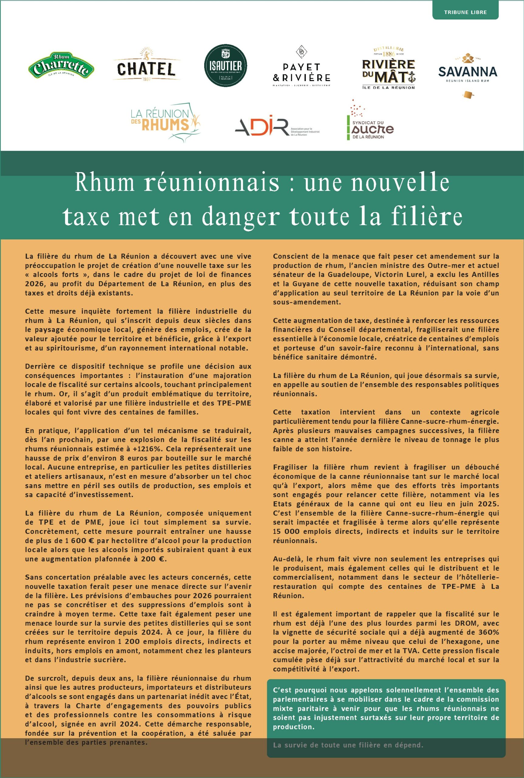 Cette mesure inquiète fortement la filière industrielle du rhum à La Réunion, qui s’inscrit depuis deux siècles dans le paysage économique local, génère des emplois, crée de la valeur ajoutée pour le territoire et bénéficie, grâce à l’export et au spiritourisme, d’un rayonnement international notable.