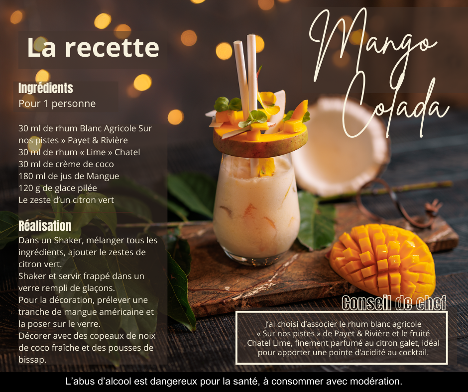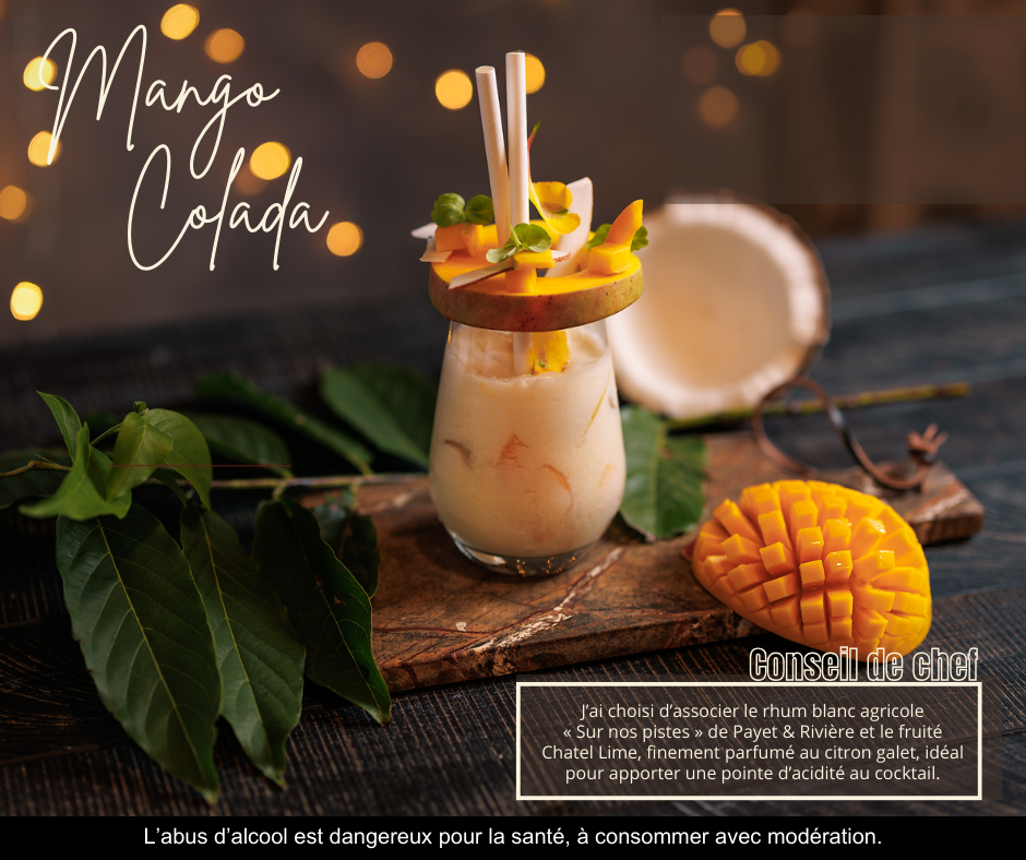 En apéritif : Mango Colada, dans une mangue américaine, rhum blanc et noix de coco