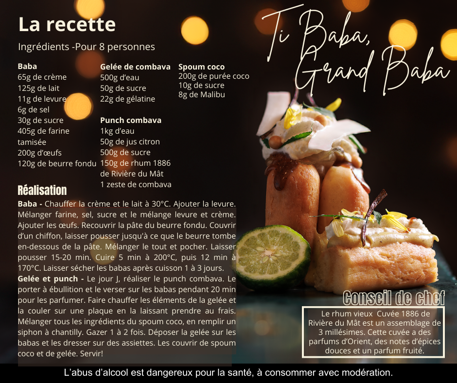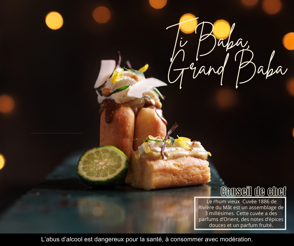 et au dessert :  « Ti baba, grand baba ! », baba au rhum, vanille et combava