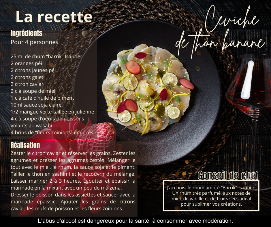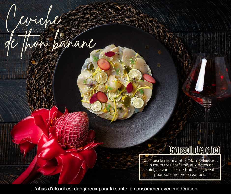 En entrée : Ceviche de thon banane, sur l’idée d’un daïquiri, citron pays et rhum brun