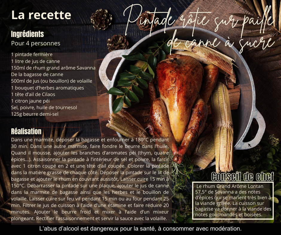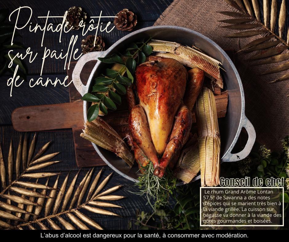 En plat principal : Pintade rôtie sur paille de canne à sucre, cuite à la marmite, avec son jus réduit au jus de canne et au rhum grand arôme
